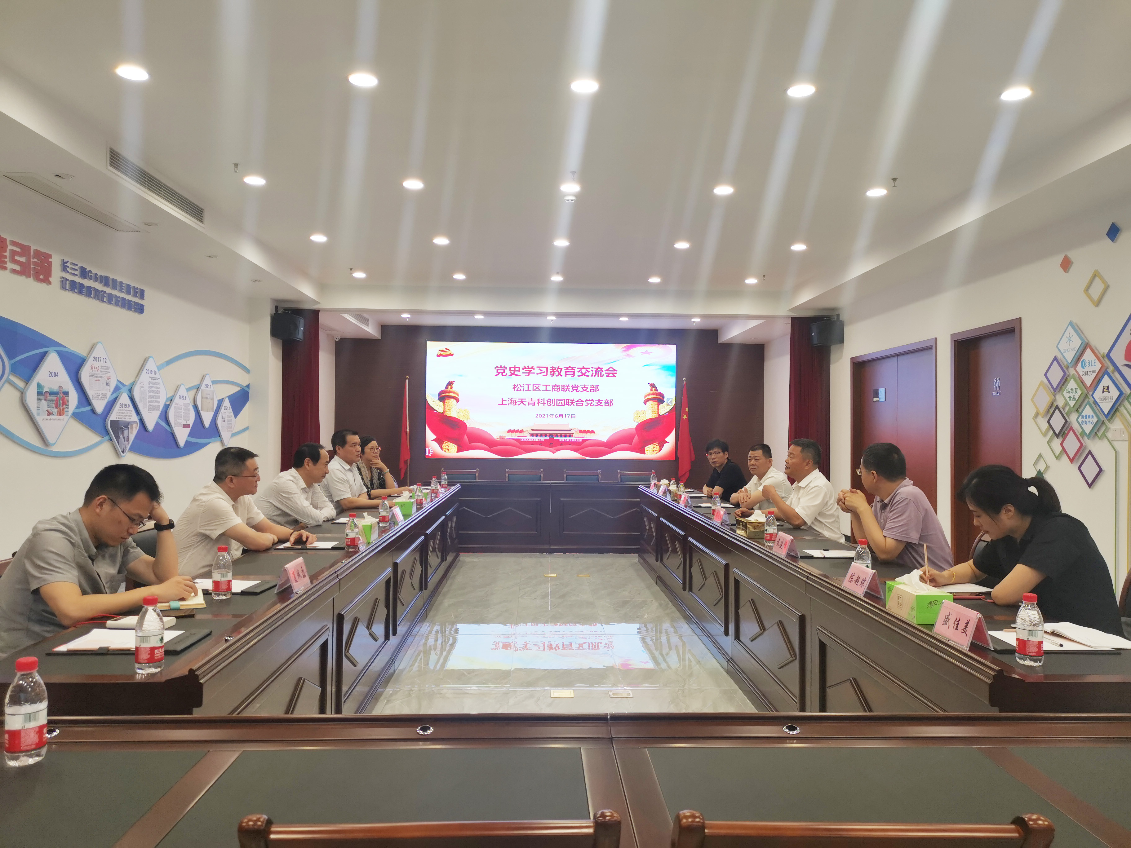 近日,市工商联党组成员、副主席施登定,区委常委、统战部部长吴继华,区委统战部副部长陆佩华,区委统战部副部长、区工商联党组书记杨仁娟,区工商联副主席袁建峰、蔡留富一行走访调研了上海天青科创园党群服务站,与九亭镇商会轮值会长、天青科创园董事长袁志清座谈交流了党史学习教育情况。