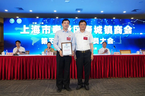 张青与陈纪忠为新当选的奉城商会会长、名誉会长颁发证书。