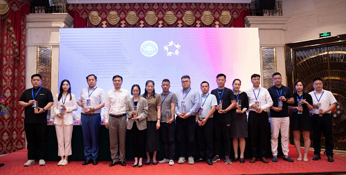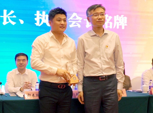 郑春颖、陈琦为万亿兆、刘晓、江楠等新当选的副会长颁发铭牌。