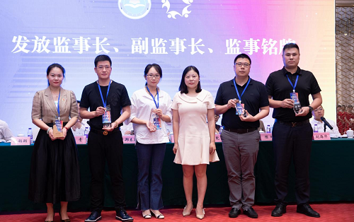 包颖颖为新当选的监事长蔡丹红、副监事长林元对、监事孔云梅等颁发铭牌。