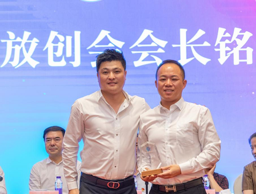 随后,骆大进为区青商会新一届会长蔡国平颁发铭牌。