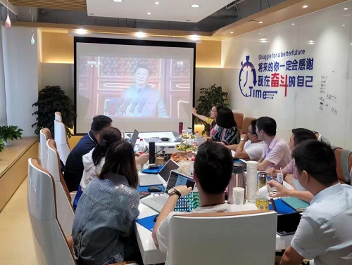 公司组织员工们一起观看纪念中国共产党成立一百周年大会直播,聆听习近平总书记的重要讲话,回顾中国共产党百年奋斗的光辉历程,展望中华民族伟大复兴的光明前景。在新的征程上,在党中央的坚强领导下,我们新时代的民营企业家们将不忘创业初心、永葆奋斗本色,坚定不移跟党走,带领自己的企业努力拼搏,为我们新时代强国梦贡献力量。
