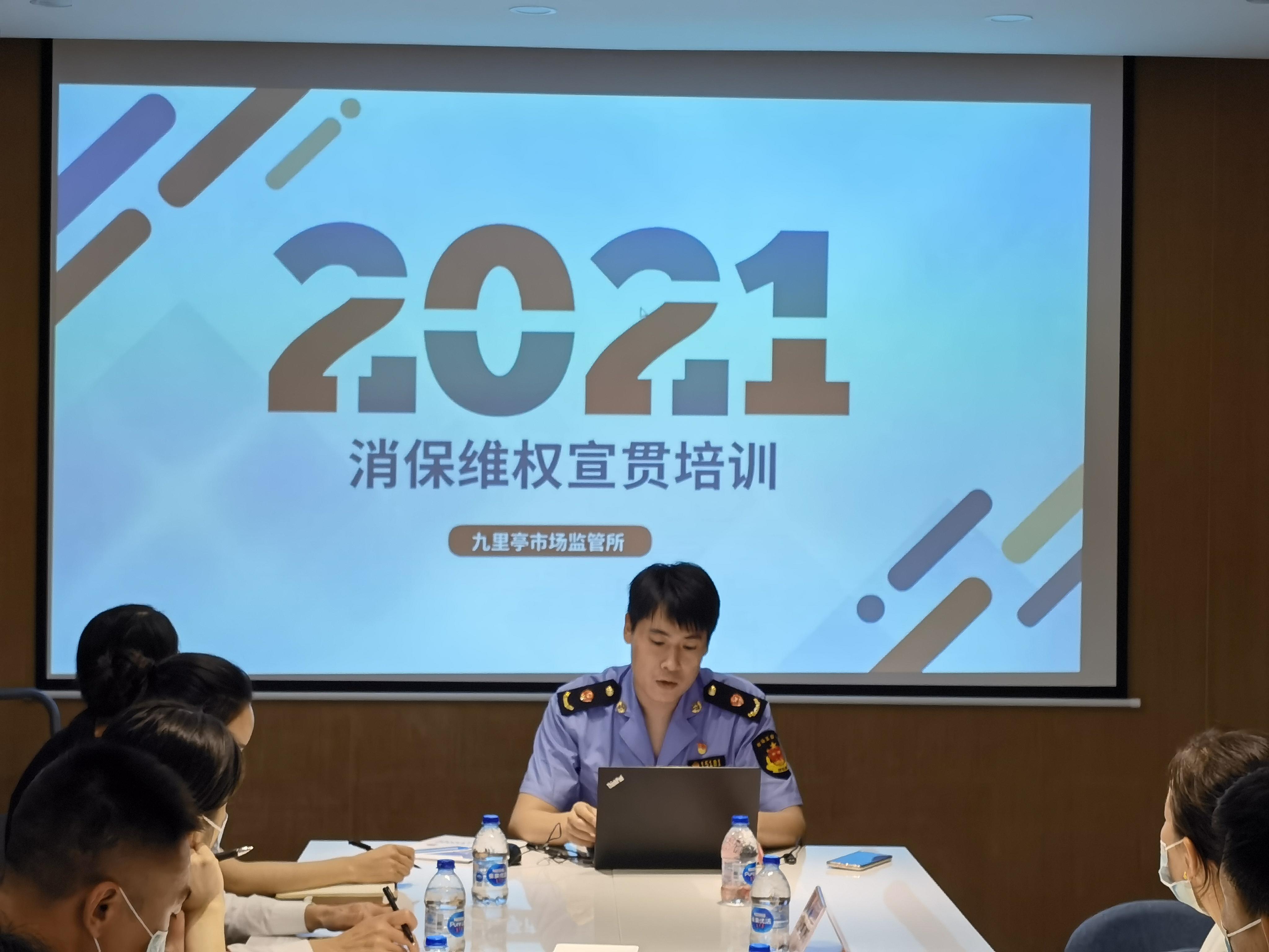 本次培训分两大板块。首先,九里亭街道市场监督管理所副所长戚舒佳结合具体的法条和案例为参加培训的商户们讲解了消保维权和知识产权保护方面的内容。