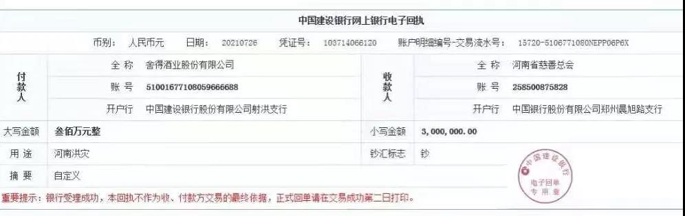 复星集团在前期捐赠5000万元的基础上,旗下舍得酒业又向河南省慈善总会追加捐赠300万元现金及250万元物资,用于支持河南防汛救灾及灾后重建工作。