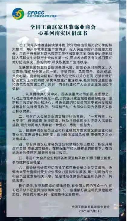 全国工商联家具装饰业商会理事长、上海市江苏商会会长、月星集团董事局主席丁佐宏号召两家商会向会员企业发出倡议,全力驰援灾区。月星集团承诺,将为在暴雨中遇难家庭的孤儿,和因救援牺牲的烈士家庭的孩子提供学费援助至顺利完成大学学业。此外,月星集团旗下的环球港、月星家居以及环球港湾项目,也将优先面向灾区群众提供就业。