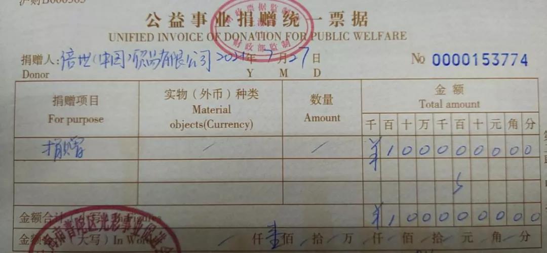 倍世(中国)贸易有限公司通过普陀区光彩事业促进会向河南慈善总会捐赠100万元,用于灾区防汛救灾和灾后重建工作。