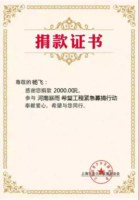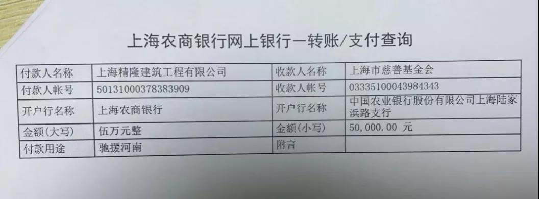上海精隆建筑有限公司通过上海市慈善基金会向河南灾区捐赠50000元,用于灾区防汛救灾和灾后重建工作。