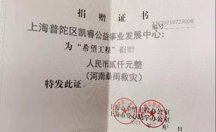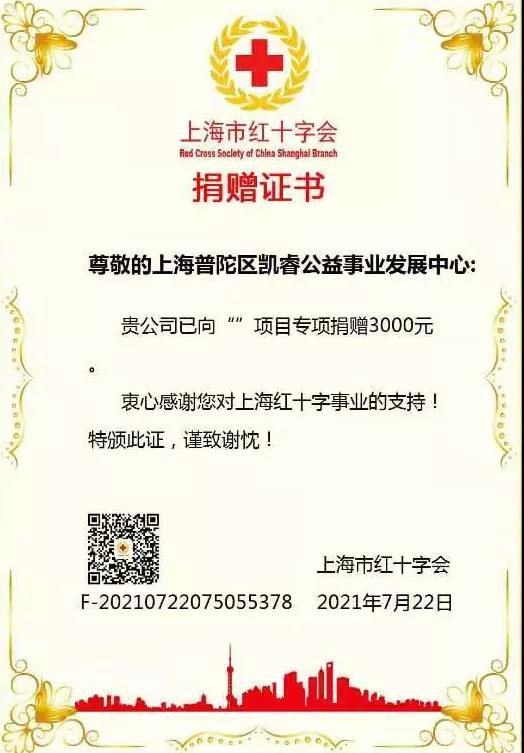 上海普陀区凯睿公益事业发展中心通过上海市红十字总会向河南灾区捐赠7000元,用于灾区防汛救灾和灾后重建工作。