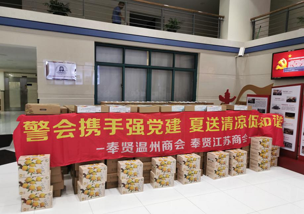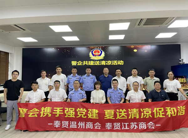 8月12日下午,奉贤区工商联温州商会联合区工商联江苏商会共同开展“警会携手强党建 夏送清凉促和谐”慰问活动。区工商联温州商会会长陈智、区工商联江苏商会会长吴彩琴及两个商会的党支部书记林剑、翟杰等出席活动。