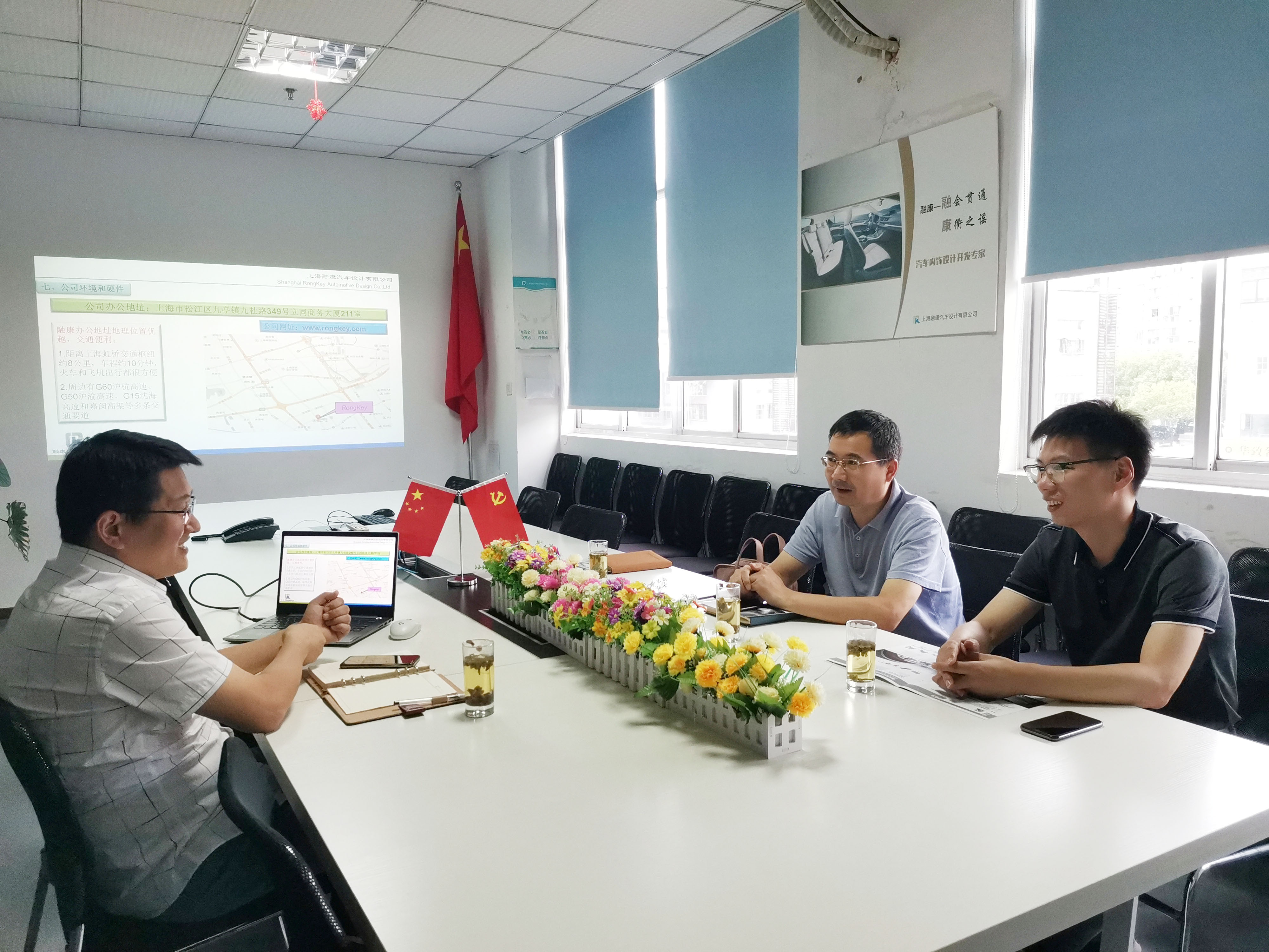 8月13日下午,松江区工商联党组成员、副主席袁建峰一行走访调研区青创联新一届班子成员。区工商联相关科室人员参加。一行人先后赴区青创联副会长单位上海玉成天赐珠宝有限公司,理事单位上海融康汽车设计有限公司、上海煜馨文化传媒有限公司,走访了解企业经营状况并进行交谈。
