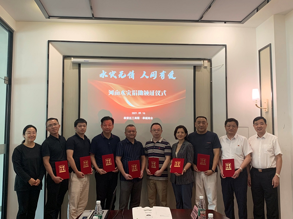 9月16日下午,奉贤区工商联联合奉城镇商会在上海金相机械设备有限公司举行“河南水灾捐助颁证仪式”。区工商联党组成员、副主席薛冬梅,奉城镇商会会长沈琪、秘书长王文国及商会部分企业代表应邀出席本次活动。
