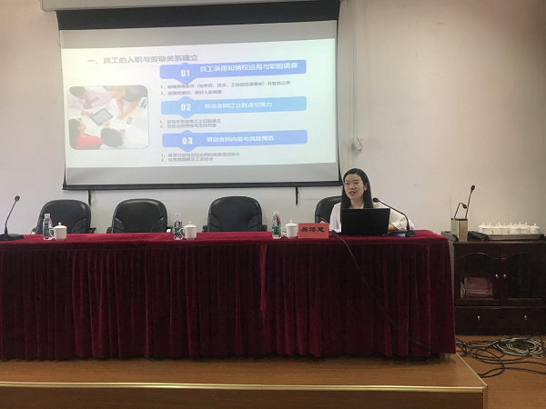 三是开展专题法治讲座。上海申诚律师事务所吴博慧律师就员工入职与离职案例现场分享研讨。吴博慧律师主要讲解了员工的入职与劳动关系建立;员工的离职与法律风险防范等劳动风险防范知识,并结合平日处理的典型案例以案释法,归纳分析目前员工入职、离职、劳动合同的订立、履行、解除,违法解除劳动合同的法律后果,劳动合同与劳务合同的区别,以及职工社会保险等问题。