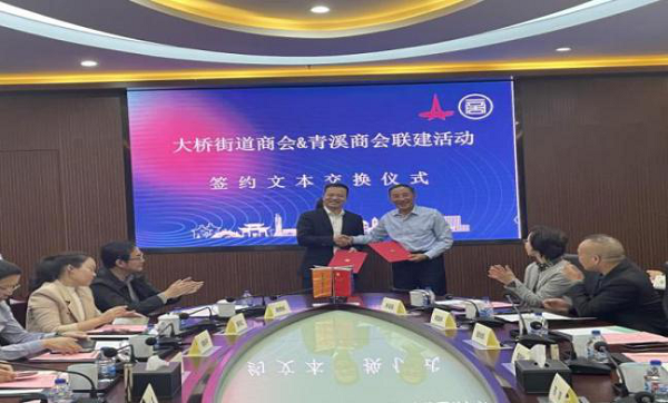 大桥街道商会与青村镇商会进行签约文本交换仪式。
