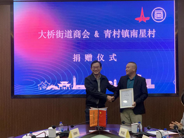 青村镇南星村书记、主任顾奇峰为大桥街道商会颁发大米捐赠证书。