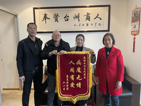 11月16日,怀着一颗真诚的感恩之心,蔡美苏推着儿子蔡健健来到奉贤区工商联台州商会办公室赠送锦旗。一面写着“病魔无情,人间有爱”的锦旗盛载了蔡美苏一家的感激之情。