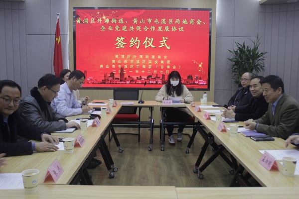12月7日下午,黄山市屯溪区国投集团党委书记、董事长茅岩带领屯溪区赴黄浦区外滩街道商会体悟实训队一行五人,来到外滩街道社区党群服务中心,举行黄浦区外滩街道商会与黄山市屯溪区工商联(总商会)党建联建促发展、两地企业高新产业基金合作战略签约仪式。黄浦区外滩街道党工委副书记许金武,黄浦区总商会副会长、外滩商会会长孙辉出席会议。