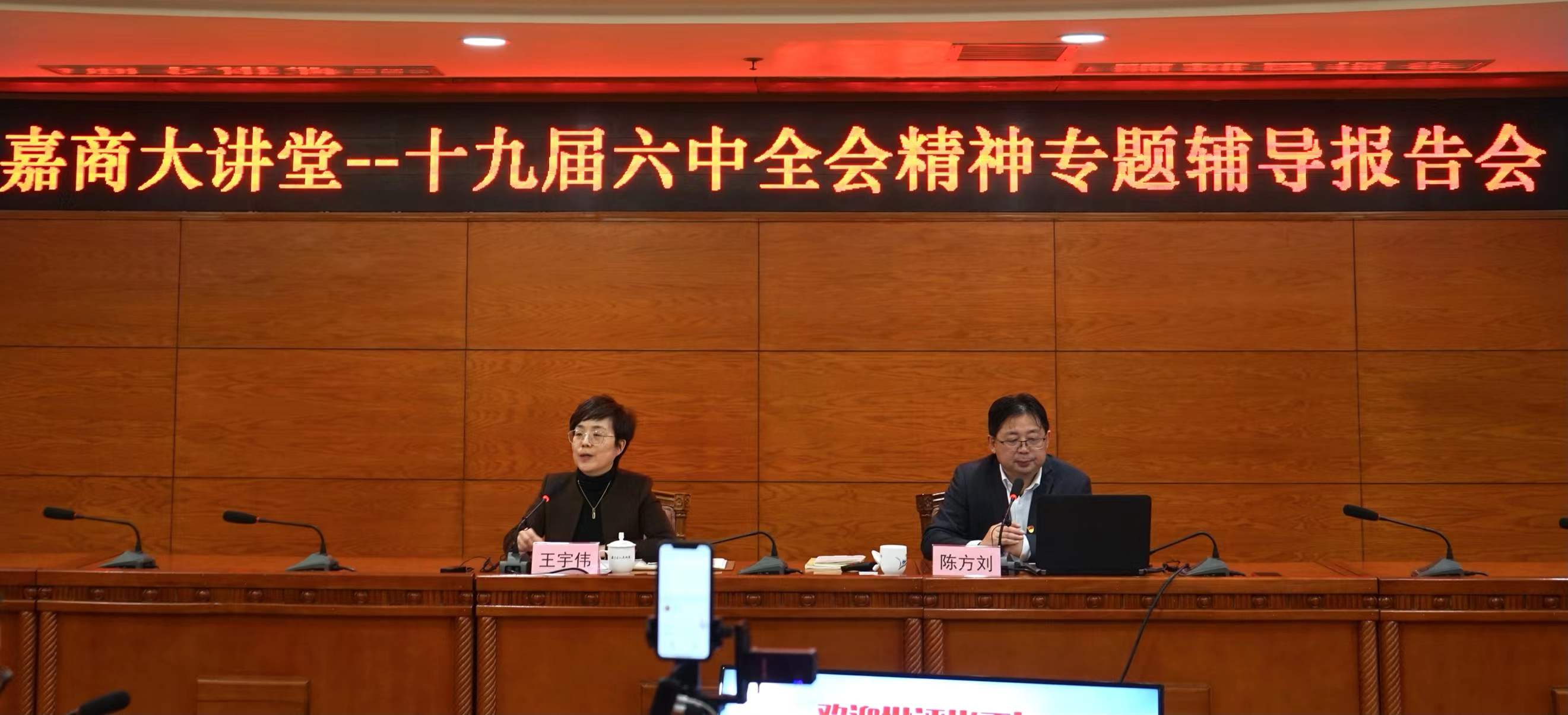 为深刻领会和把握十九届六中全会的重要内涵,切实把思想和行动统一到全会精神上来,1月5日下午,嘉定区工商联(总商会)在区综合办公楼A500会议室举办2022年首场“嘉商大讲堂”,邀请上海市委党校马克思主义学院副院长、上海市党史宣讲团成员陈方刘教授作《在新时代新征程上赢得更加伟大的胜利和荣光——深入学习贯彻十九届六中全会精神》专题辅导报告。区委统战部副部长、区工商联党组书记王宇伟主持。