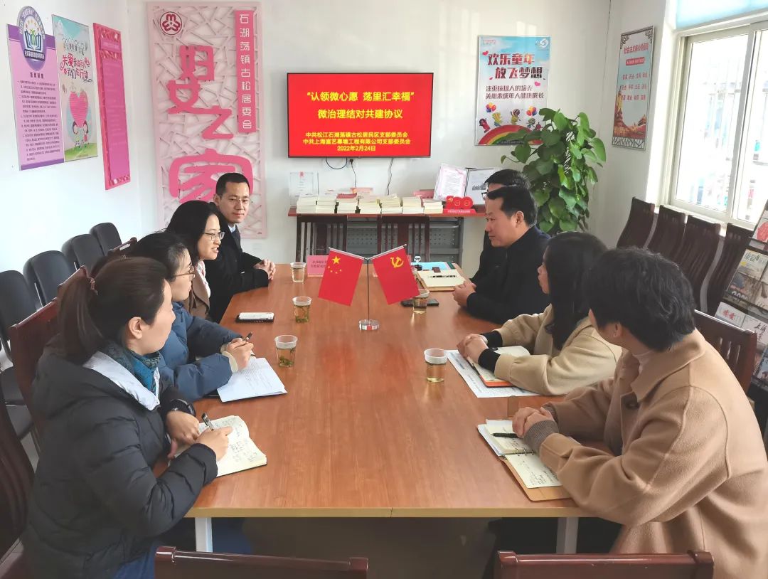 中共松江石湖荡镇古松居民区支部委员会与镇青创联会长单位、镇商会会员单位中共上海富艺幕墙工程有限公司支部委员会就创建“银龄自治议事会”,打造社区议事阵地等事宜进行了沟通。