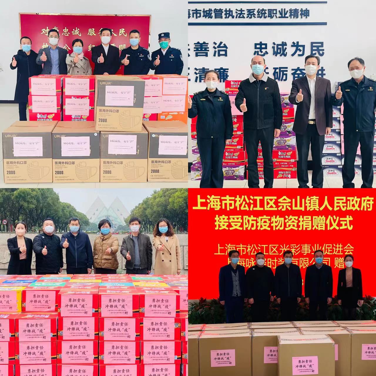 面对抗疫物资紧缺的情况,区工商联副主席单位上海华铭智能终端设备股份有限公司、上海华美电梯装饰有限公司、上海咏姿时装有限公司,区总商会副会长单位上海樱丹企业管理服务有限公司、上海轩浩进出口有限公司通过区光彩事业促进会捐赠了医用外科口罩2万只、普通口罩7万余只、方便面400箱、矿泉水150箱,向奋战在一线的抗疫工作人员、志愿者们送去了安全防护罩和来自民营企业的关怀。区工商联副主席单位上海华美电梯装饰有限公司向泖港镇捐赠了N95口罩1万只、医用一次性防护服1千套,为防疫工作提供了坚强的后盾和有力保障。区工商联常委单位上海乔翊娅食品有限公司向泖港镇共捐助达克瓦兹蛋糕96盒、奶油小方蛋糕350个、精品96粒装马卡龙4箱,让坚守在防控一线的工作人员感受到了浓浓暖意。区工商联执委单位上海宝鹿车业有限公司组织安排公司员工自己开车搬运,将捐助的100箱食品连夜运送到一线抗疫工作者身边。