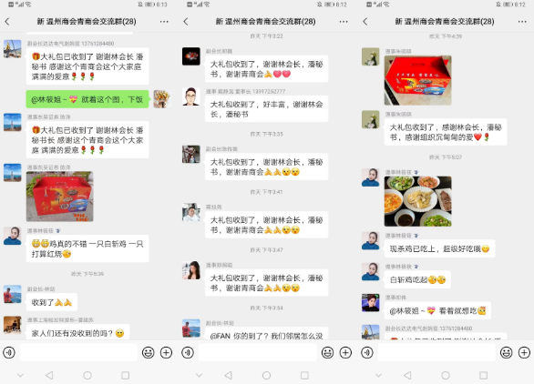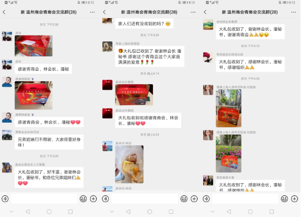 会员们收到爱心礼包后纷纷在群里留言晒图,感谢商会送来的爱心礼包,会员们也都深深感受到了商会这个大家庭的关怀和温暖。