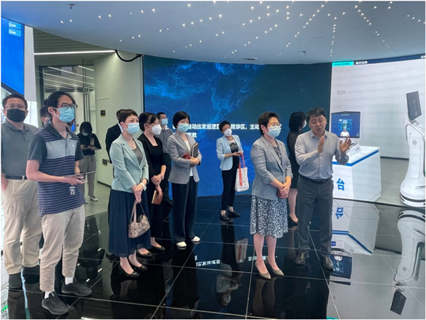 调研组一行首先参观了钛米机器人企业展厅,现场观摩体验部分产品应用场景。钛米机器人董事长潘晶就企业基本情况、发展历程、参与疫情防控相关情况及未来发展方向作详细介绍,并就政策制度、法律法规及人才用工方面提出相关建议。