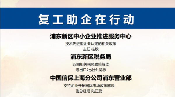 会上,浦东新区工商联会同区税务局(进出口处)、区中小企业推进服务中心和中国信保等单位对技术先进型企业认定相关政策、近期出口退税相关政策、支持开拓国际市场相关政策以及出口险保费和资信费扶持政策作宣介解读,并现场建立线上工作对接群,针对个别企业在企业资质认定、税务及国际贸易中可能遇到的重点、难点问题及时对接,形成解决方案。