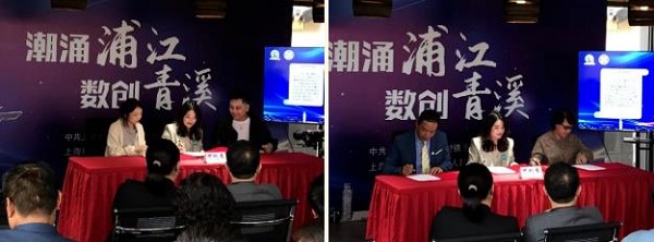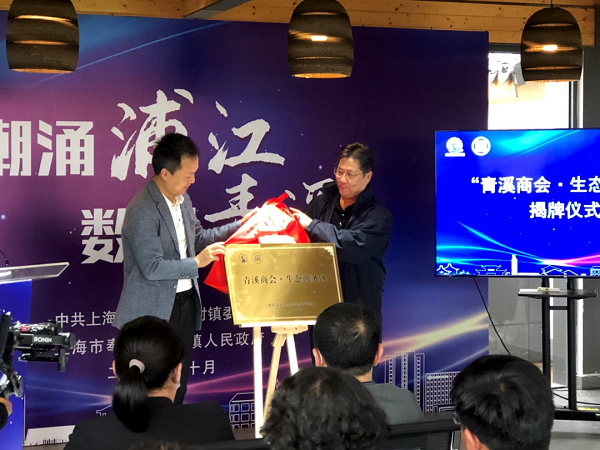 青溪商会会长刘军和奉贤区农业农村委员会一级调研员徐新根共同为“青溪商会·生态商务区”揭牌。