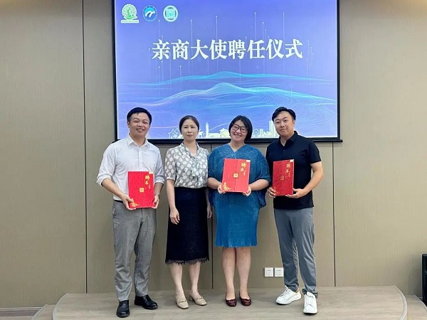 区经委外资服务协调科科长唐珏为冯杰、卫烈、夏芳芳颁发青村镇亲商大使聘书。