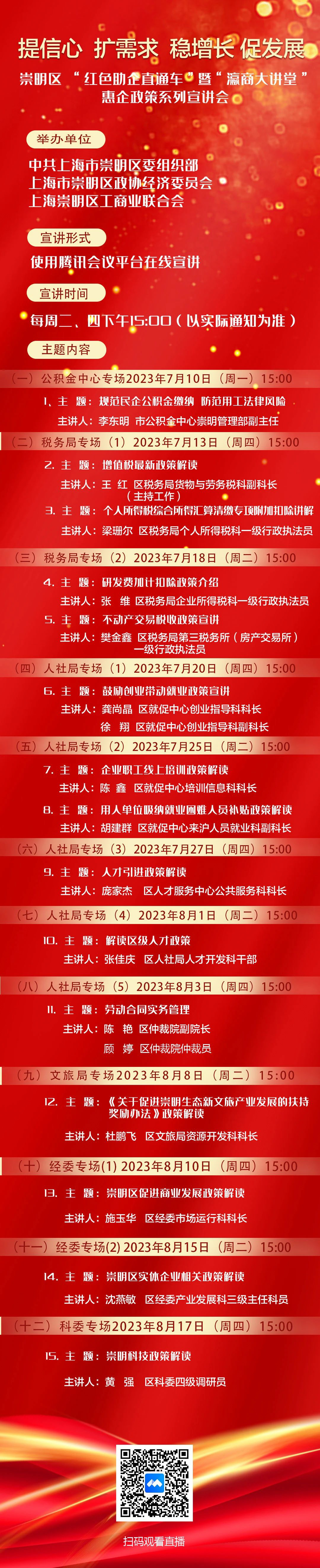 为大力提振民营企业发展信心,着力优化民营企业发展环境,落实区委促进民营经济高质量发展大会精神,促进各项助企政策更好落实落地,崇明区工商联联合区社会工作党委、区政协经济委员会共同举办“红色助企直通车”暨“瀛商大讲堂”惠企政策线上系列宣讲活动。活动得到区经委、科委、文旅、人社、税务等部门以及市公积金中心崇明管理部的支持,共提供15堂在线讲座,拟在7-8月举办12场宣讲会。