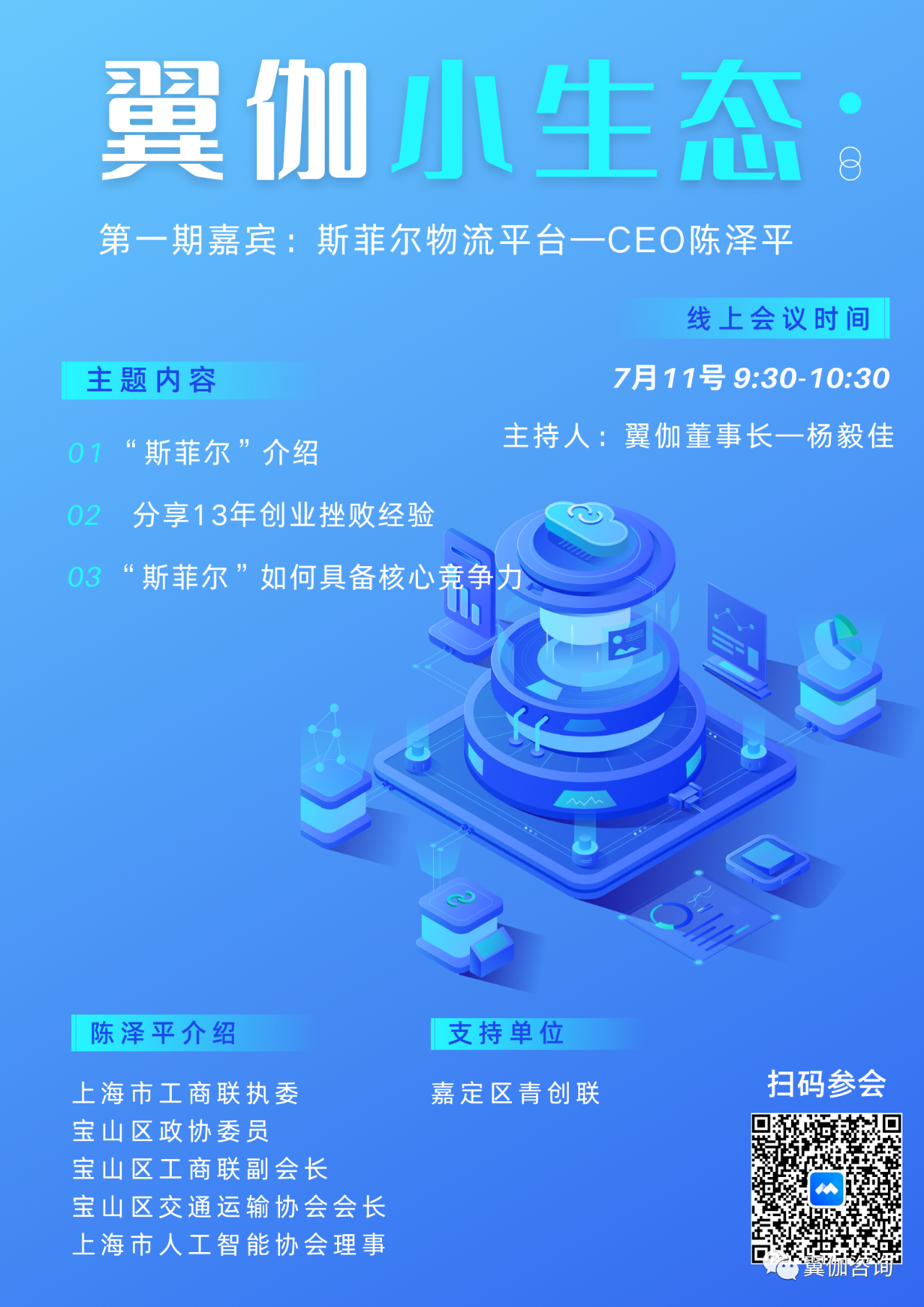 7月11日下午,由嘉定区青创联支持,区青创联副会长企业上海翼伽企业管理咨询有限公司主办了《翼伽“小生态”第一期:斯菲尔物流平台线上分享会》,区青创联副会长杨毅佳主持会议,30余家中小企业线上参会。