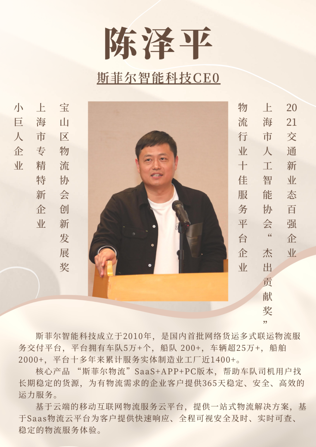 会上,上海市工商联执委、斯菲尔(上海)智能科技股份有限公司CEO陈泽平详细介绍了斯菲尔的基本情况、战略布局、运营模式,以及首批网络货运多式联运物流服务交付平台、“斯菲尔物流”SaaS+APP+PC版本的优势。同时,他结合自身创业经历分享解答了如何带领企业和员工寻找前进方向等问题。