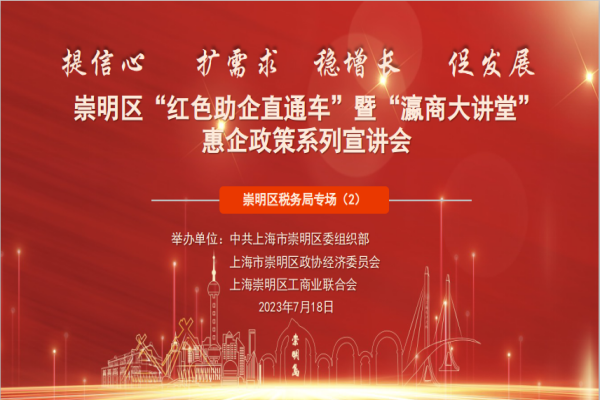 7月18日下午,崇明区“红色助企直通车”暨“瀛商大讲堂”惠企政策系列宣讲会举办区税务局专场,全区企业家代表110余人参会。本场宣讲会是系列活动的第三场,也是区税务局的第二个专场。