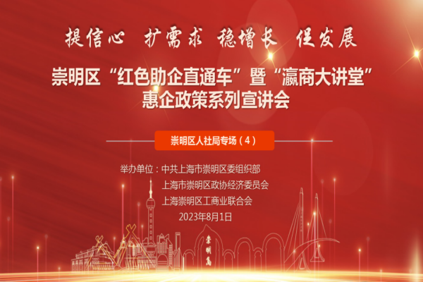8月1日下午,崇明区“红色助企直通车”暨“瀛商大讲堂”惠企政策系列宣讲会举办区人力资源和社会保障局专场,全区企业家代表140余人参会。本场宣讲会是系列活动的第七场,也是区人社局的第四个专场。