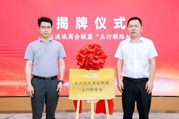 邬桥经济园区主任冯建军、长江流域商会联盟执行秘书长张毅松为长江流域商会联盟“庄行联络站”揭牌。