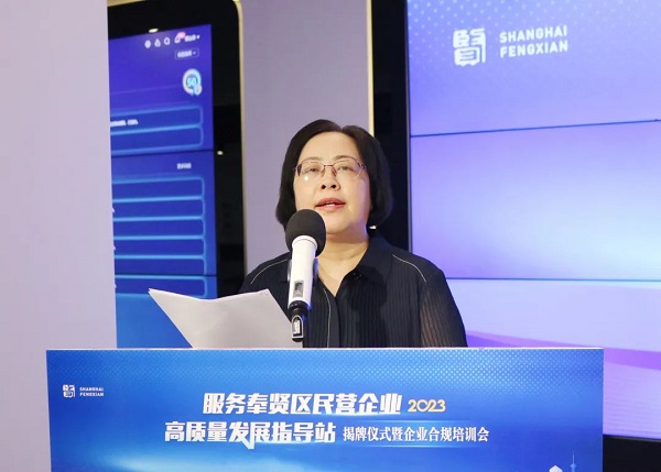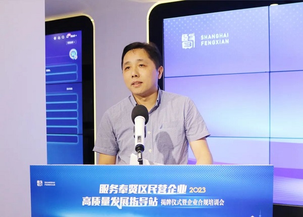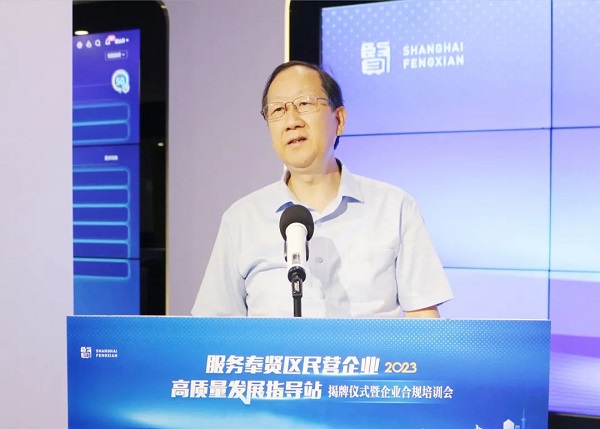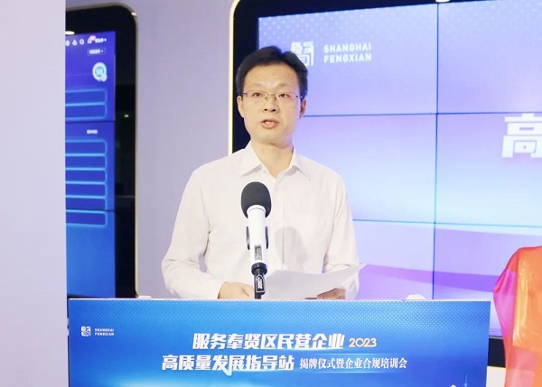 8月15日,奉贤区工商联与区市场监管局联合召开服务奉贤区民营企业高质量发展指导站揭牌仪式暨合规培训会。区委统战部副部长、区工商联党组书记张青,区市场监管局党组书记、局长曹栋,区工商联党组成员、副主席薛冬梅、黄观明,区市场监管局党组成员、副局长查红、刘珍云出席活动,区合同信用促进会、区国际商会及区工商联所属各商会秘书长,区市场监管局服务经济发展办公室服务专员和各服务团队负责人,以及区内部分民营企业代表参加。会议由黄观明主持。