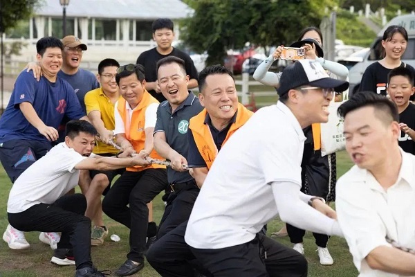随着裁判的一声哨响,拔河比赛拉开了帷幕。队员们扎稳马步、紧握长绳,拼尽全力向后使劲,每位队员都竭尽全力,表现出顽强的团队精神。