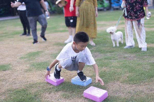 欢呼声、呐喊声此起彼伏,“摸石头过河”比赛开始了,小朋友们手脚并用,展现了较好的协调能力和耐力,在游戏中大家相互鼓励、笑语不断,脸上都挂满了开心的笑容。