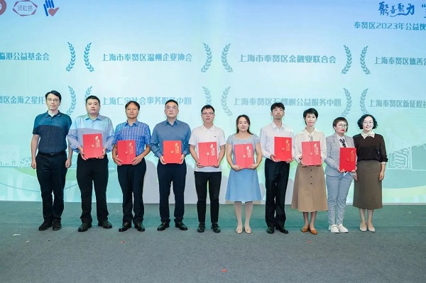奉贤区温州商会荣获2023年金海街道“益益生辉”公益伙伴奖,商会秘书长吴育衡(右三)代表商会现场接受颁奖。