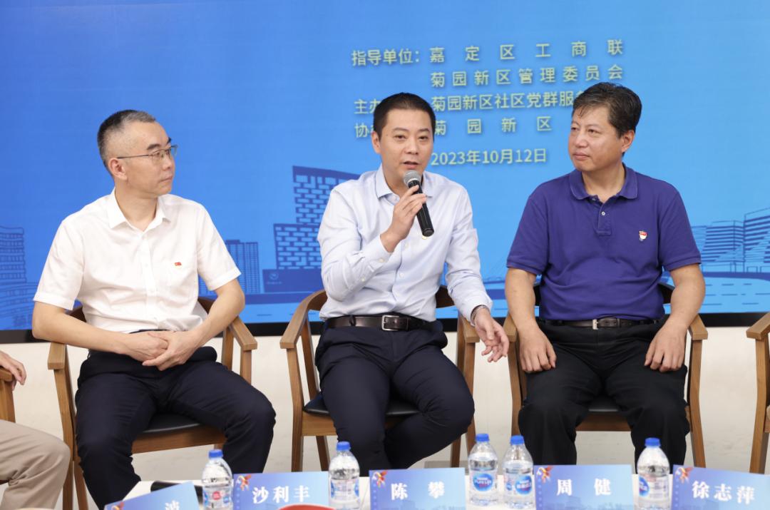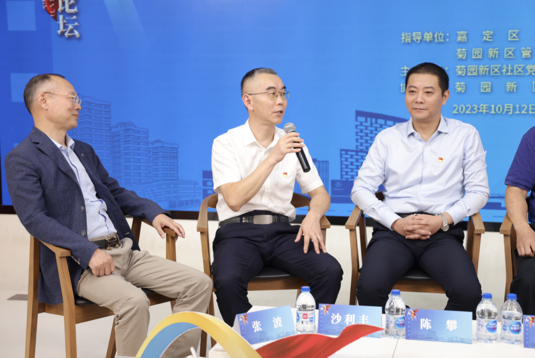 论坛邀请到嘉定区工商联副主席陈攀,菊园新区党工委委员、管委会副主任周健,菊园新区商会秘书长、上海水之园经济城有限公司党总支副书记、副总经理徐志萍,菊园新区商会党支部书记、上海丰祝建设工程管理服务中心总经理沙利丰,上海左岸芯慧电子科技有限公司董事长张波等5位嘉宾参加讨论。菊园新区商会以及民营企业代表等50余人参加了现场活动,线上直播观众达到2400多人。