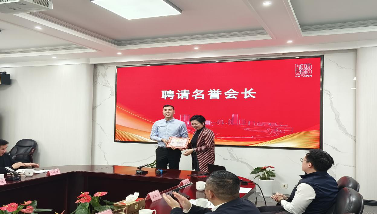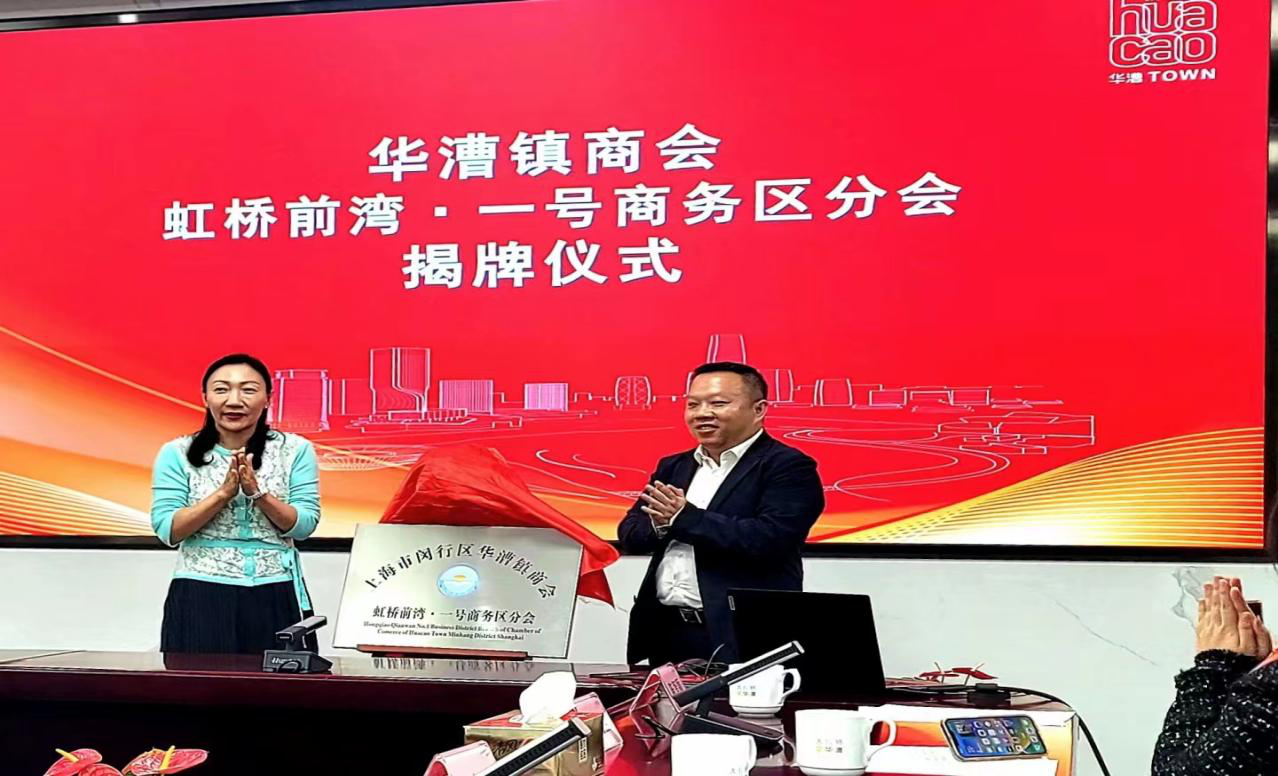 随后华漕镇第一个商会分会虹桥前湾一号商务区分会正式成立。刘丽斌与商会分会会长陈振华共同为分会揭牌。