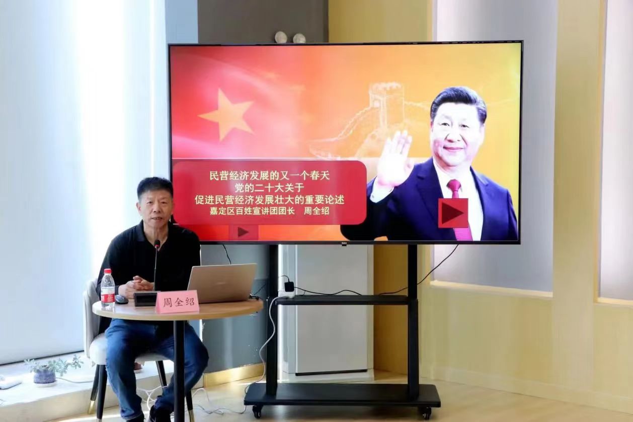 本次学习会邀请中共嘉定区委宣传部百姓宣讲团团长、嘉定区党的二十大精神宣讲团成员、区委党校原副教授周全绍为党员们作《民营经济发展的又一个春天——党的二十大关于促进民营经济发展壮大的重要论述》专题报告。周全绍教授从民营经济的前世今生、二十大关于发展民营经济的重要论述、统一思想凝聚共识放手发展等三个方面,阐述了党中央毫不动摇鼓励、支持、引导民营经济发展壮大的坚定决心。