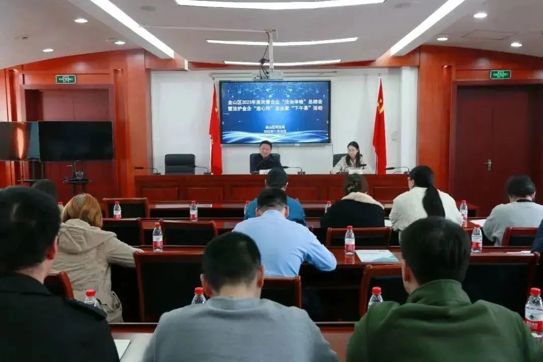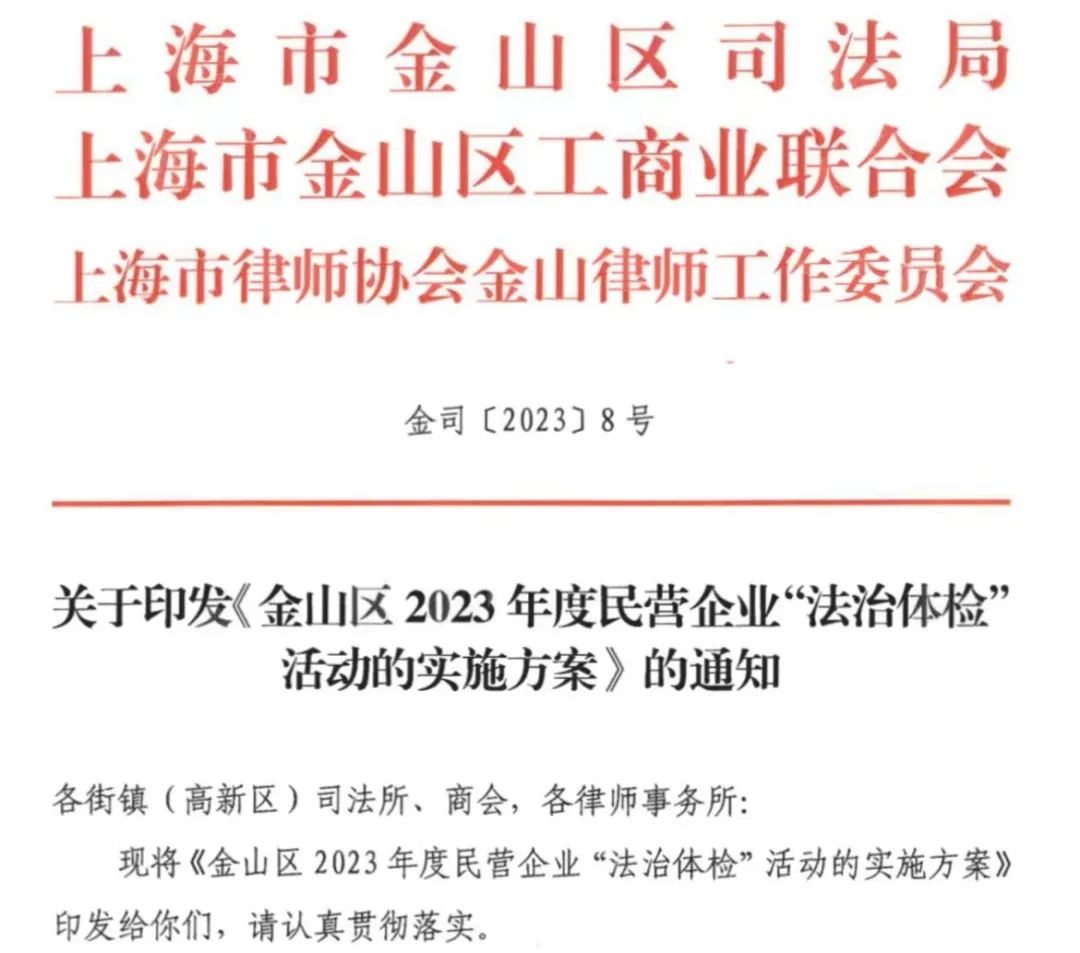 为深入开展学习贯彻习近平新时代中国特色社会主义思想主题教育,全面落实“学思想、强党性、重实践、建新功”总要求,以专业精准、优质高效的组团式法律服务助力法治化营商环境建设,金山区工商联与区司法局、区律工委联合组织开展2023年度民营企业“法治体检”活动。