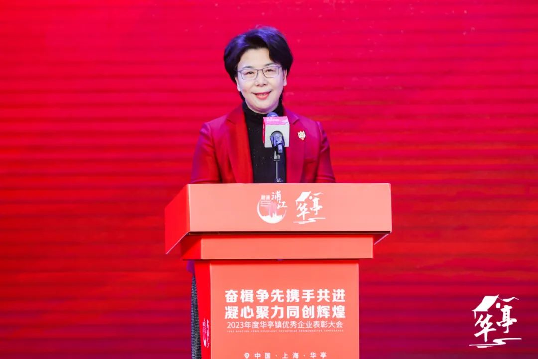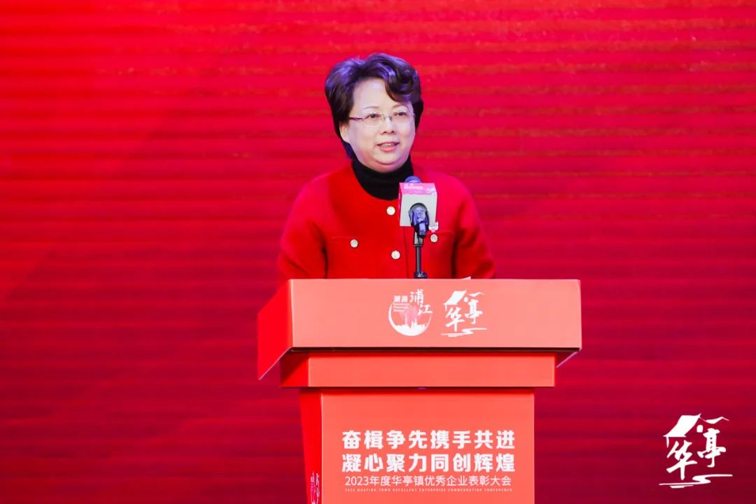 华亭镇党委书记何蓉为表彰大会致辞。她表示,华亭将肩负起乡村振兴重大责任,锚定经济高质量发展目标,始终当好企业发展的“服务员”,优化环境的“督办员”和尊商重企的“护航员”,与广大企业家们一起,共同谱写新篇章。