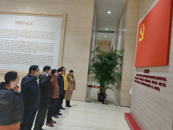 在工作人员的带领下,党员们面对中国共产党党旗一起重温入党誓词。坚定洪亮的宣誓声回荡在大厅之内,提醒大家时刻不忘初心,坚定理想信念。