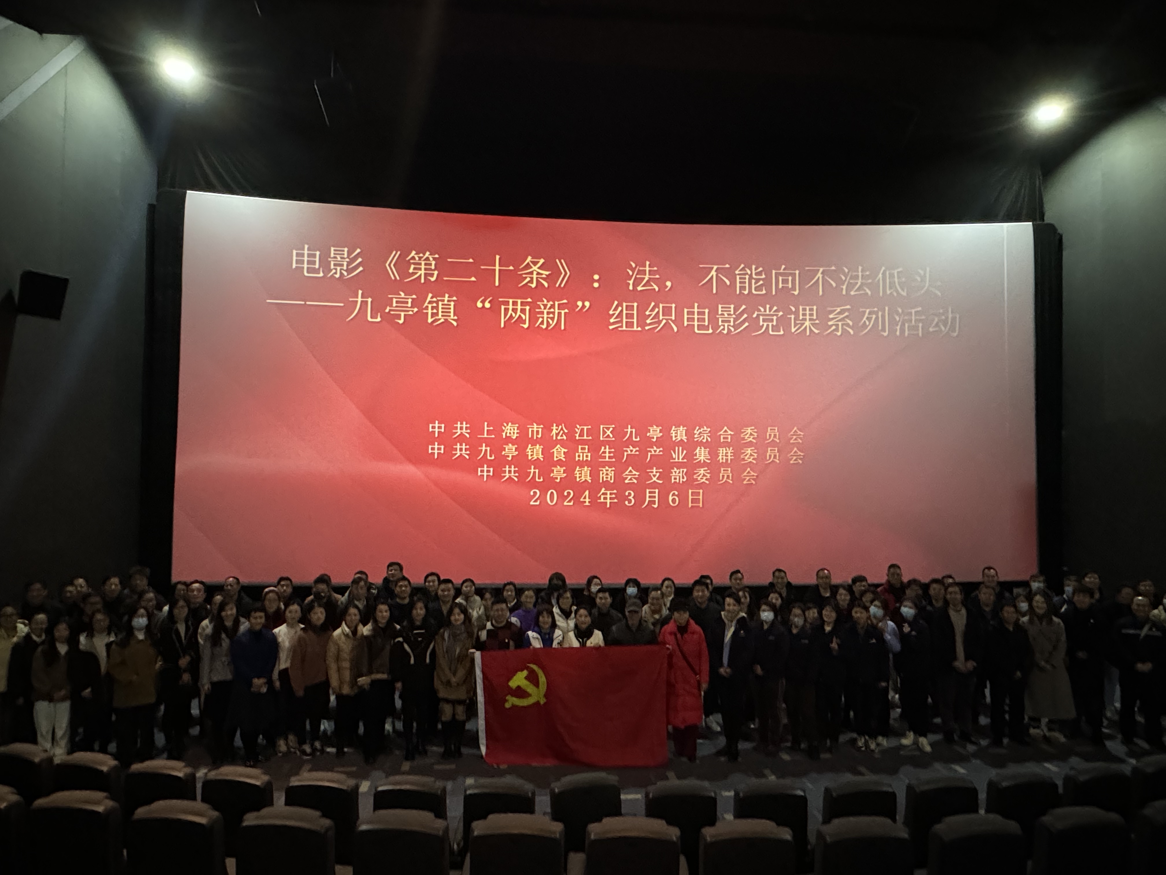 为深入学习贯彻习近平法治思想,大力弘扬法治精神,引导“两新”组织党员在光影中增强法治思维能力,凝聚奋进力量,3月6日下午,松江区九亭镇综合党委联合镇食品生产产业集群党委、镇商会党支部组织开展九亭镇“两新”组织电影党课系列活动——“法,不能向不法低头”。“新经济组织和新社会组织”党组织书记、党员、流动党员、发展对象、入党积极分子等160余人走进影院集体观看法律主题电影《第二十条》,共同上了一堂别开生面的“电影党课”。