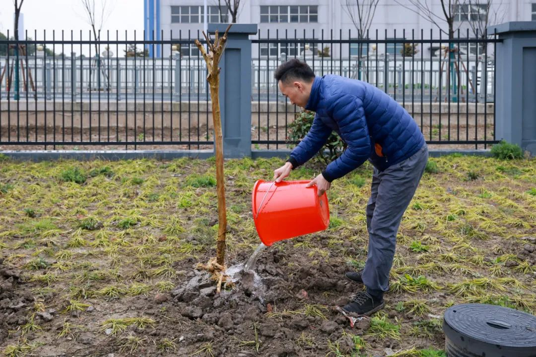 扶木正枝,挥锹培土……大家冒雨扶苗、培土、浇灌。放眼望去,植树现场处处呈现出一派热火朝天的劳动景象。大家两三人一组,相互配合、分工有序,踩土定植、浇水灌溉,将一株株树苗悉心栽植在规划植树点上,并在每棵树上挂上认养牌,为“徐行沃土”增添新绿和希望。