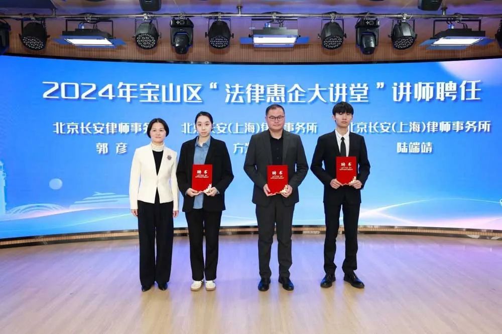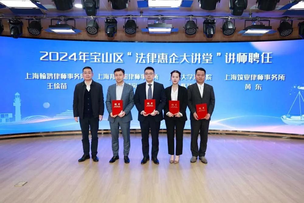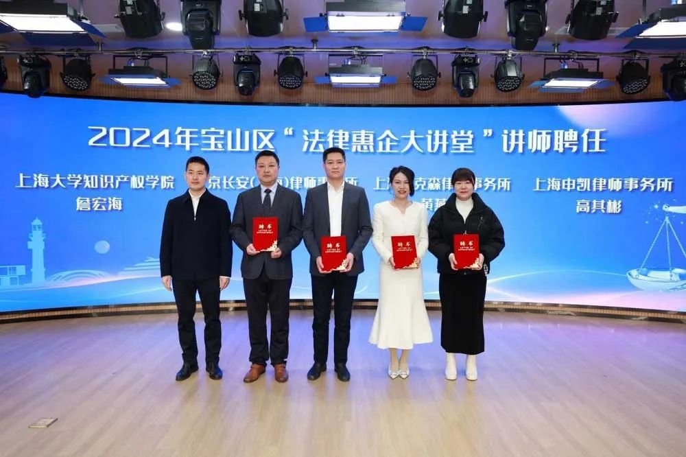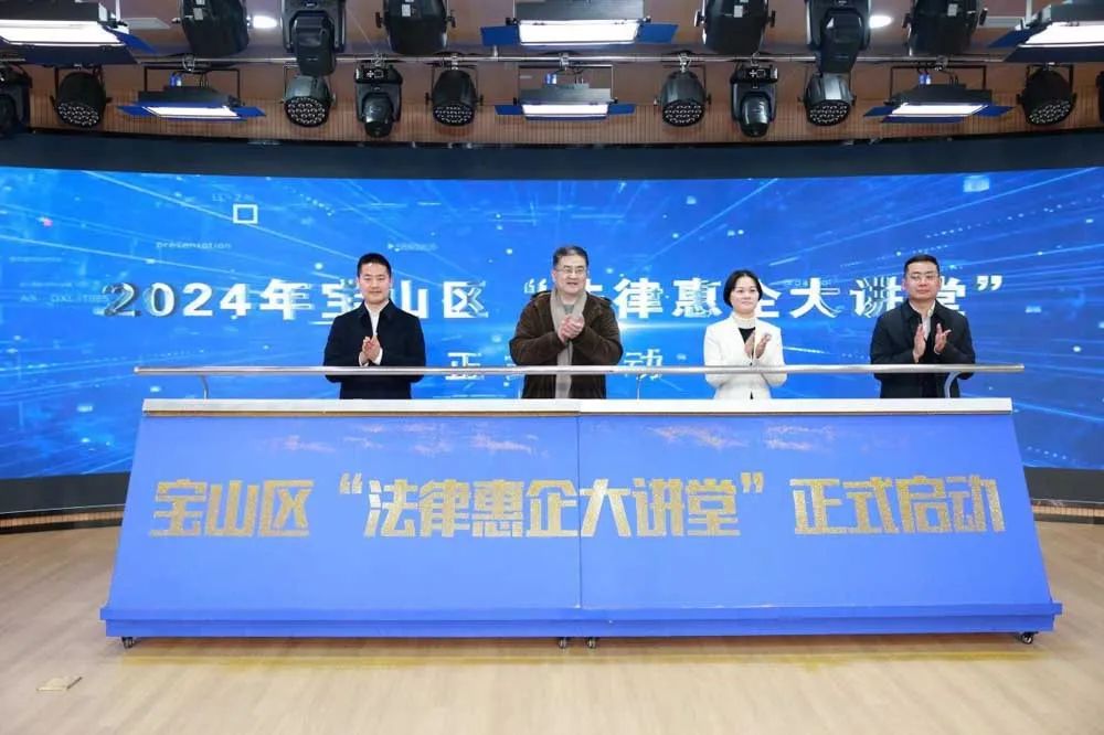沈伟民、潘振飞、黄一欣、陈一岚共同启动宝山区“法律惠企大讲堂”活动。