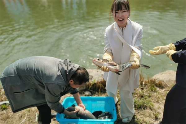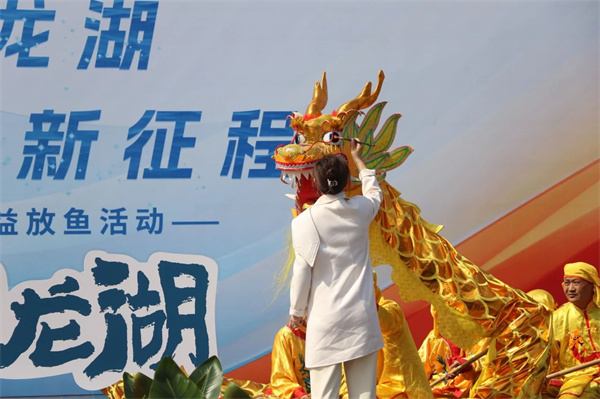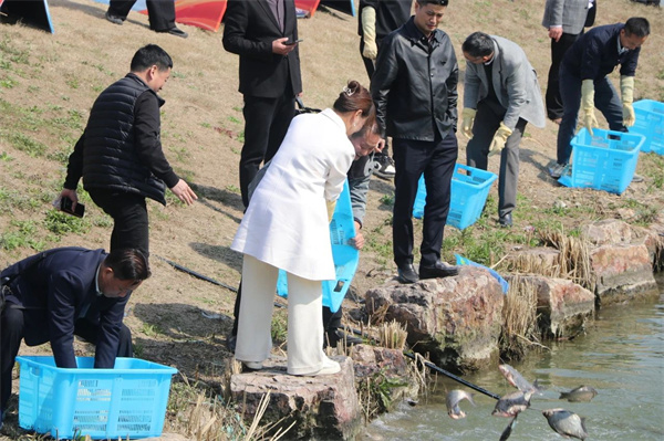 最后,由吴彩琴、韩佩伦、高翌等在申龙湖畔共同将鱼苗放至申龙湖内,一起争做绿水青山就是金山银山理念的积极传播者和模范实践者。