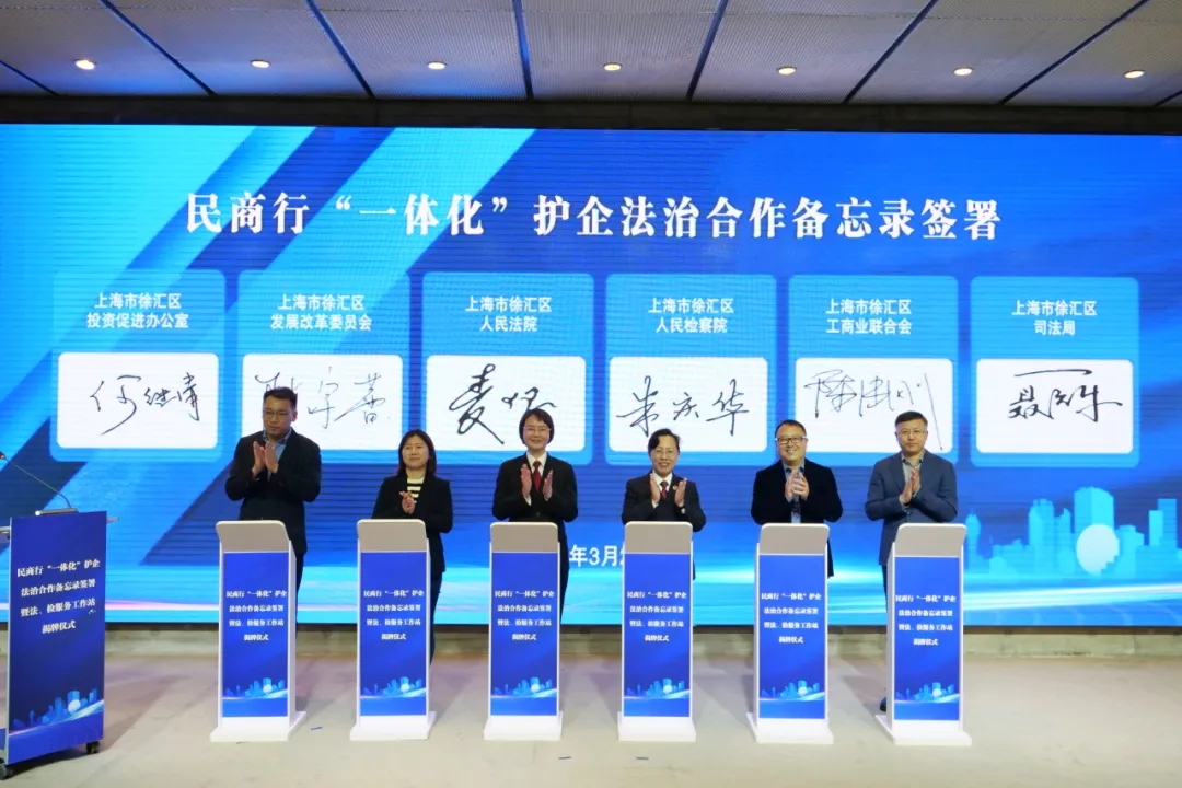 3月28日下午,徐汇区《民商行“一体化”护企法治合作备忘录》签署暨法、检服务工作站揭牌活动在徐汇区华鑫慧享中心举行,此次活动也揭开了徐汇民营企业服务月的序幕。活动由徐汇区人民法院、区检察院、区发改委、区司法局、区投促办、区工商联等六单位主办,徐汇区虹梅街道协办,六单位、职能部门负责人及企业代表出席活动。