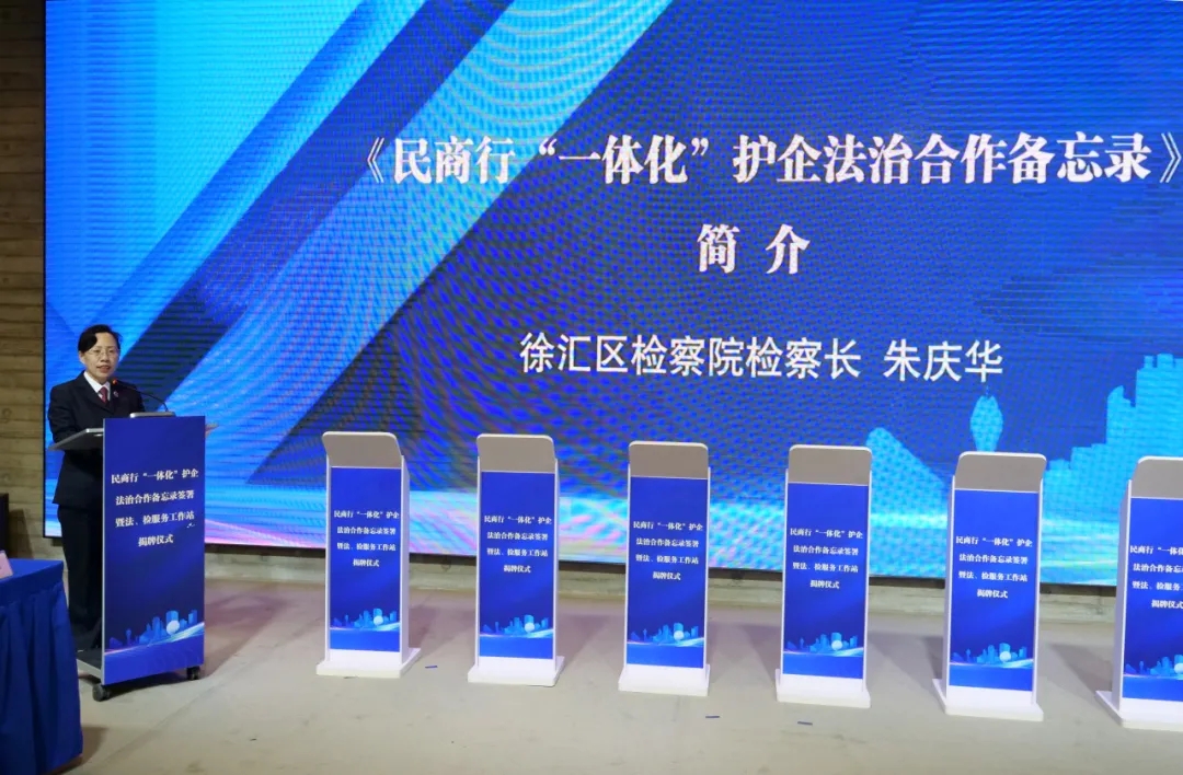 徐汇区检察院检察长朱庆华对《民商行“一体化”护企法治合作备忘录》进行介绍。